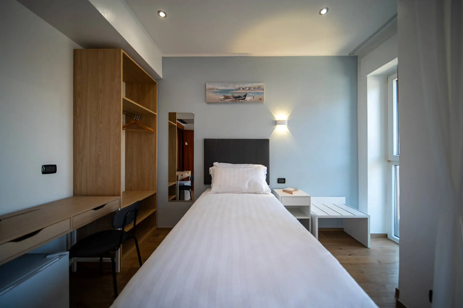 Ogni camera riflette lo stile essenziale e contemporaneo che caratterizza l’hotel: arredi pratici, linee pulite e ambienti luminosi che favoriscono relax e concentrazione. Che tu viaggi da solo, in coppia o con colleghi, siamo pronti per accoglierti in degli spazi pensati per farti sentire sempre a tuo agio.