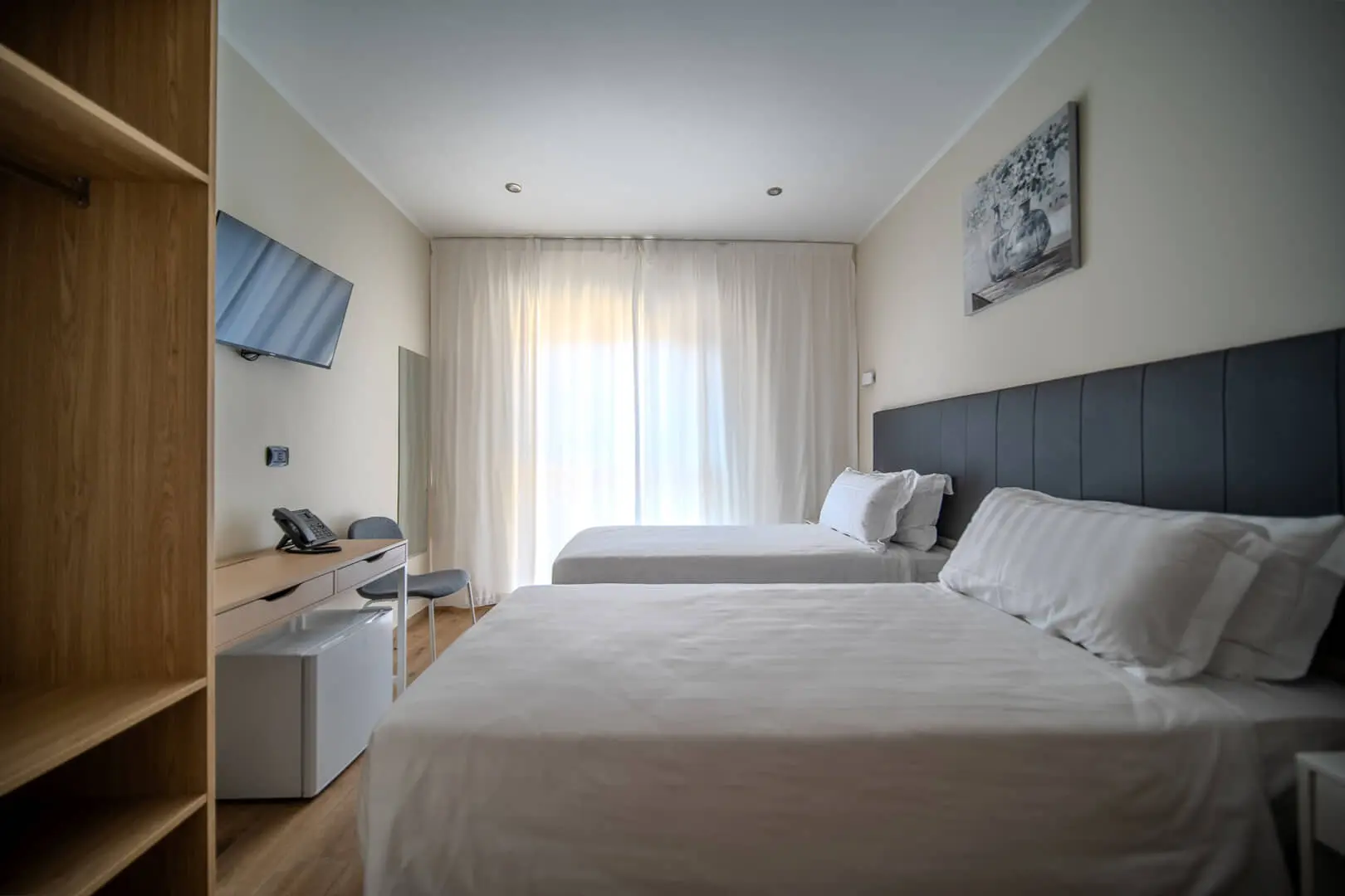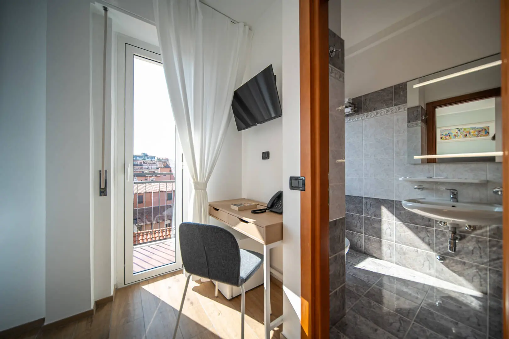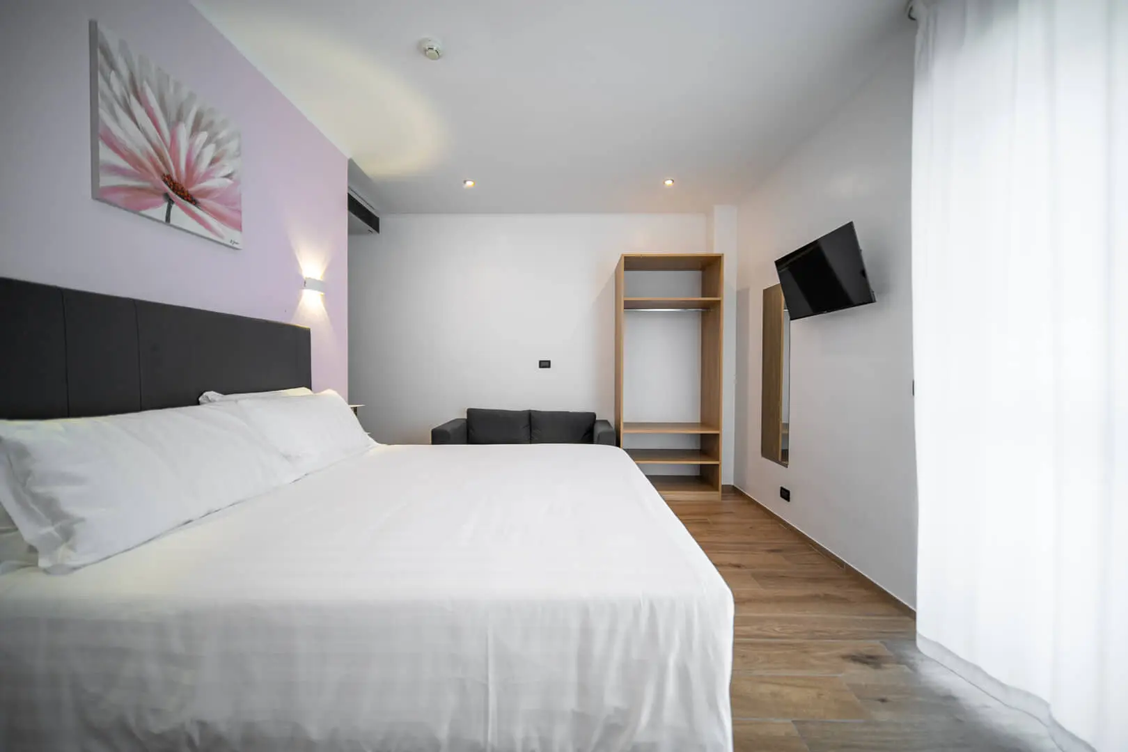 La nostra camera Matrimoniale è pensata per chi viaggia in coppia o con un collega e desidera un ambiente piacevole e funzionale. I colori neutri e gli arredi essenziali creano un’atmosfera rilassante, perfetta per staccare la spina dopo una giornata di incontri o spostamenti. Il bagno privato, la connessione Wi-Fi veloce e la climatizzazione autonoma garantiscono il massimo comfort. L’ideale per dormire bene e ripartire con energia.