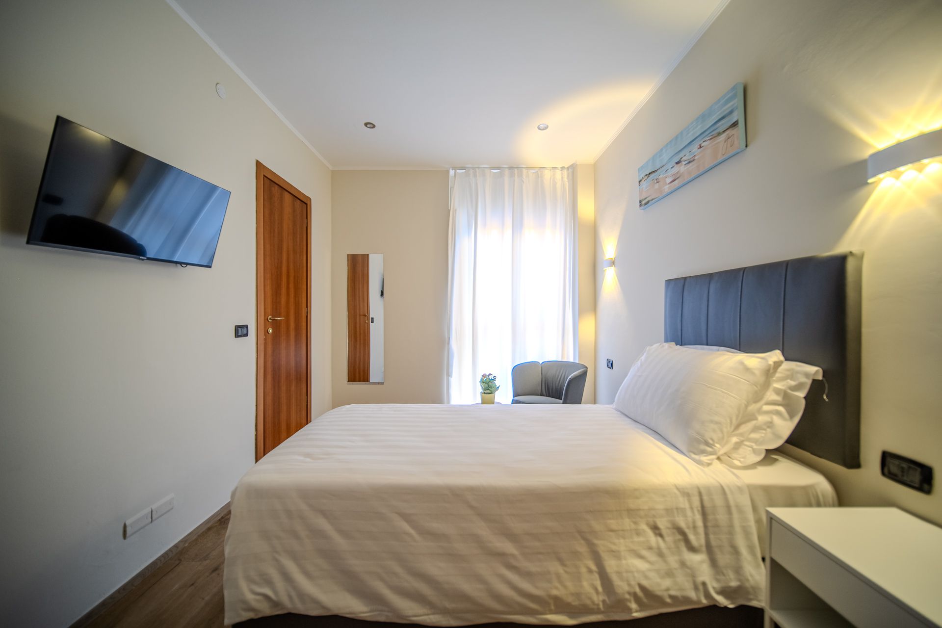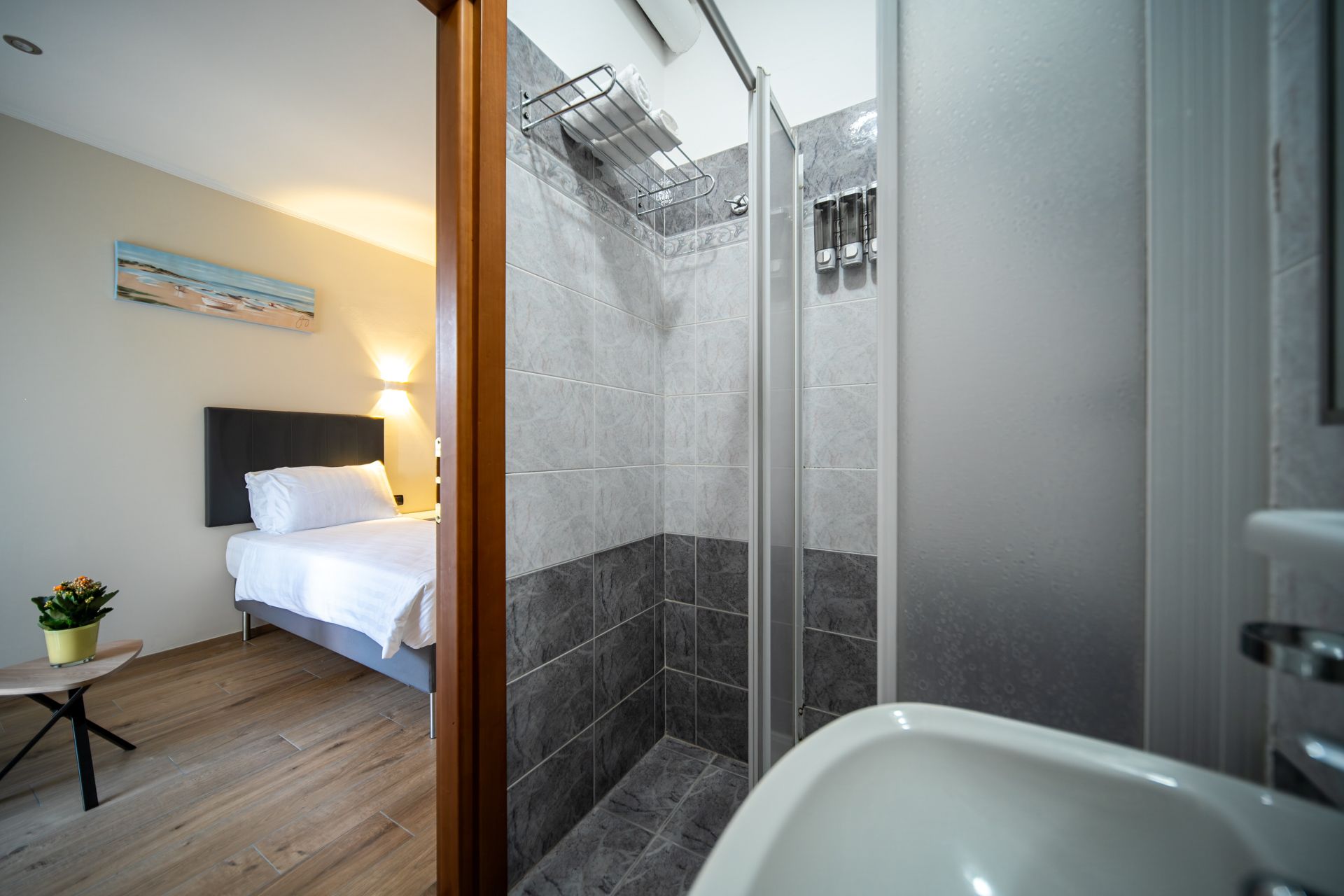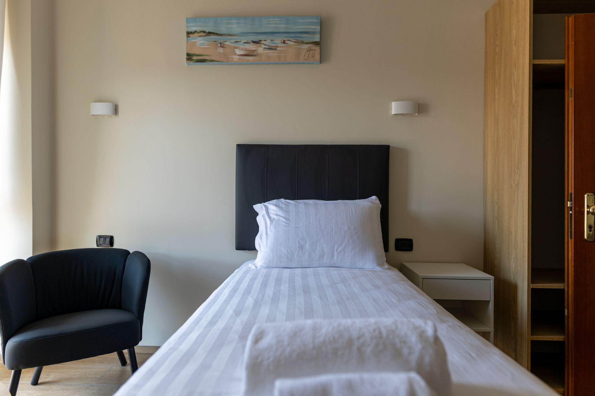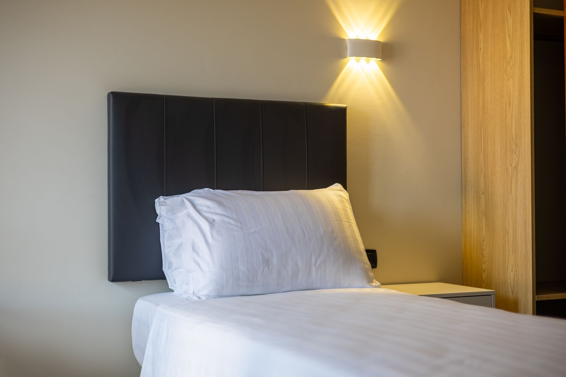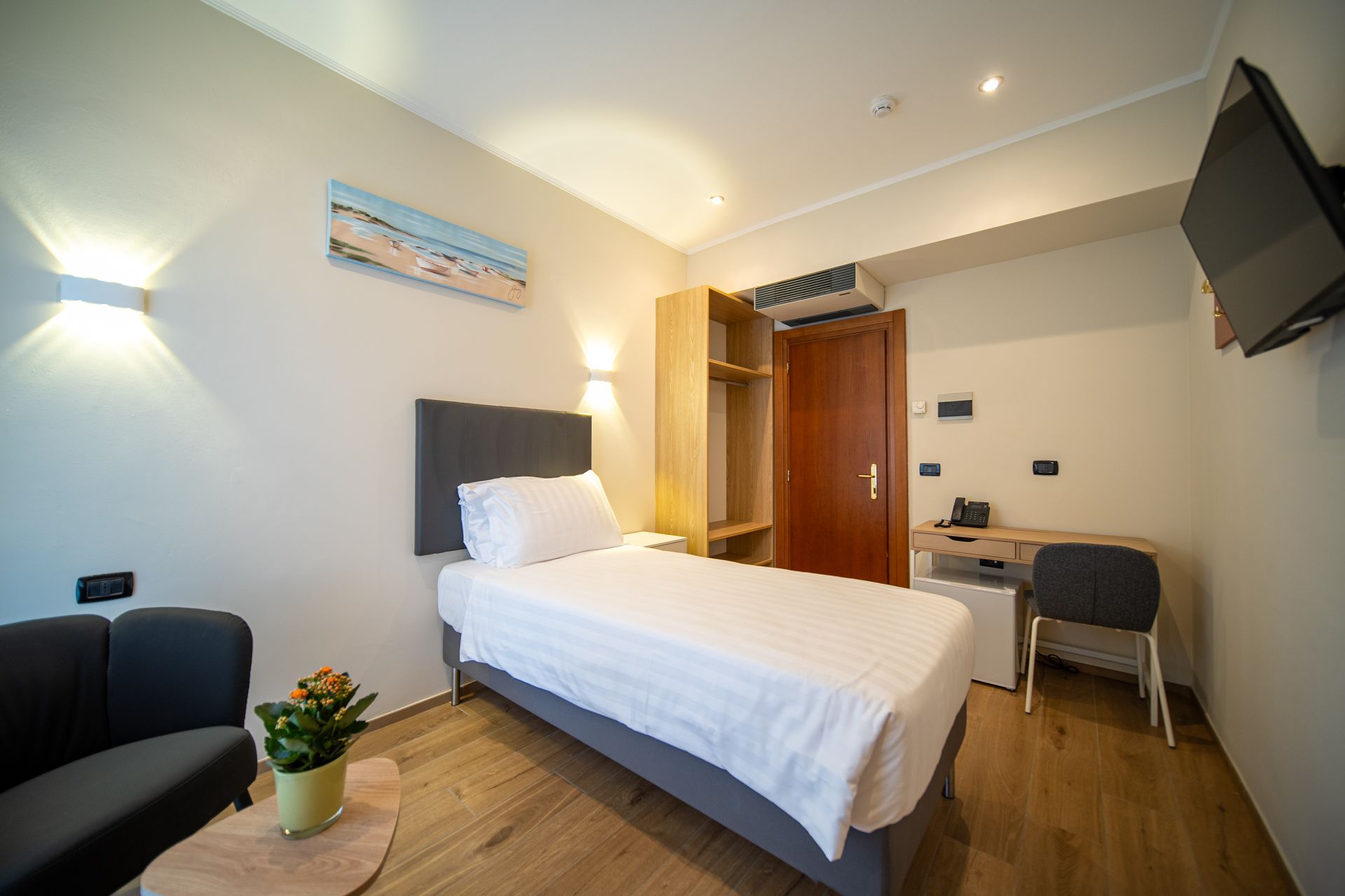 La nostra camera Singola è pensata per chi viaggia da solo e cerca funzionalità senza rinunciare allo stile. L’ambiente è luminoso, silenzioso e ben organizzato, con arredi minimal e linee pulite che trasmettono ordine e serenità. Una comoda scrivania permette di lavorare in concentrazione, mentre il letto accogliente garantisce un sonno rigenerante. Il bagno privato, la connessione Wi-Fi veloce e la climatizzazione regolabile completano una soluzione semplice, efficiente e confortevole.